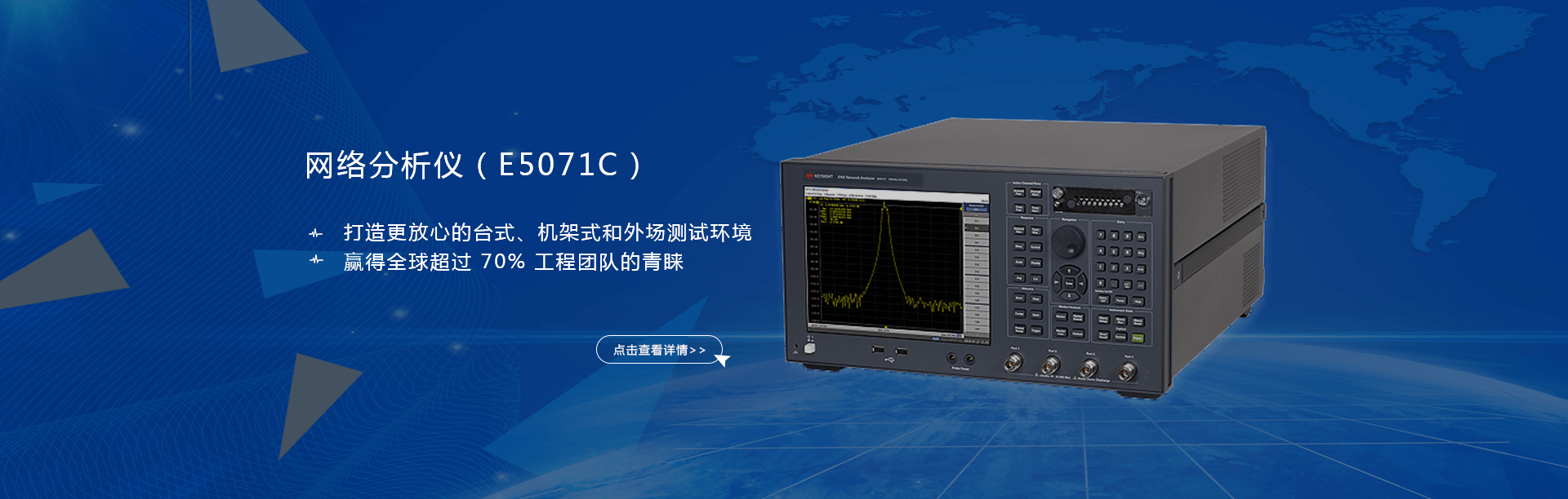主要產(chǎn)品有:頻譜分析儀,網(wǎng)絡(luò)分析儀,綜合測試儀,藍(lán)牙wifi測試儀,噪聲系數(shù)測試儀,接收機,電話測試儀,高、低頻信號源,音、視頻信號分析儀,高精度萬用表, LCR/ 電橋、各種通信電源等。經(jīng)營的儀器品牌主要有:Keysight/Agilent (惠普 / 安捷倫)、 R/S (羅德 & 施瓦茨)、 Anritsu (安立)、Litepoint、 FLUK( 福祿克 ) 、 TEK (泰克)等。